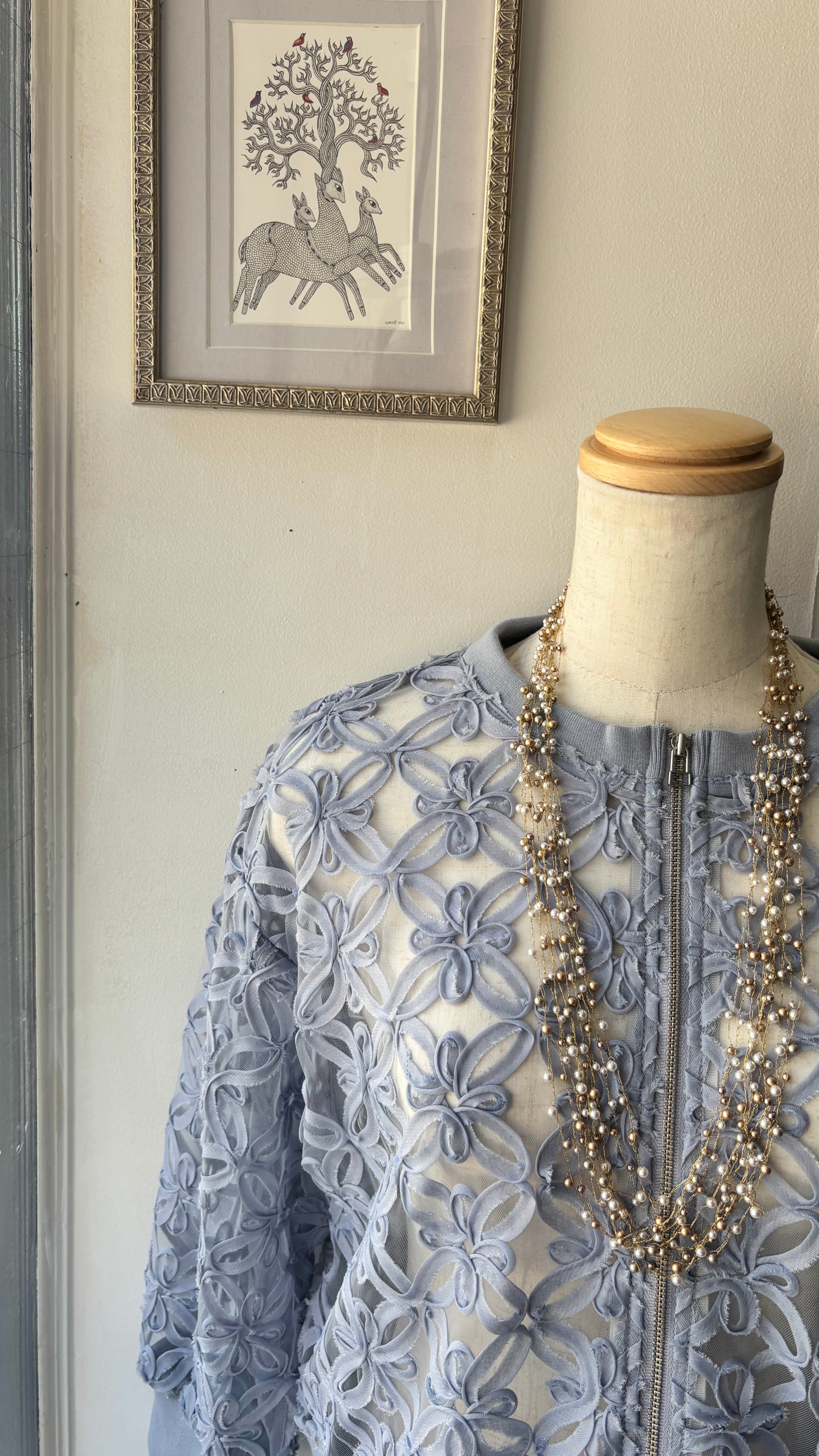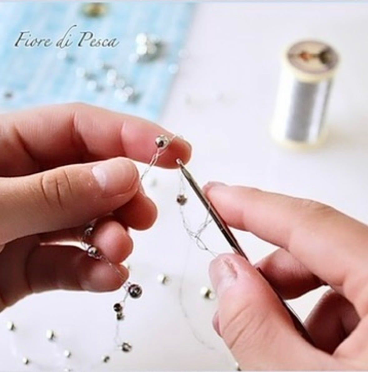 粒の大きさにリズムをつけながら編み込むことで上品さの中に華やぎと奥行きが生まれ動くたびにやさしくきらめきます